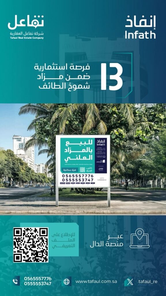 ويُعد مزاد “شموخ الطائف” فرصة جاذبة للباحثين عن الفرص الاستثمارية الواعدة، حيث ترحب شركة تفاعل العقارية بجميع الاستفسارات عبر التواصل على الرقم: